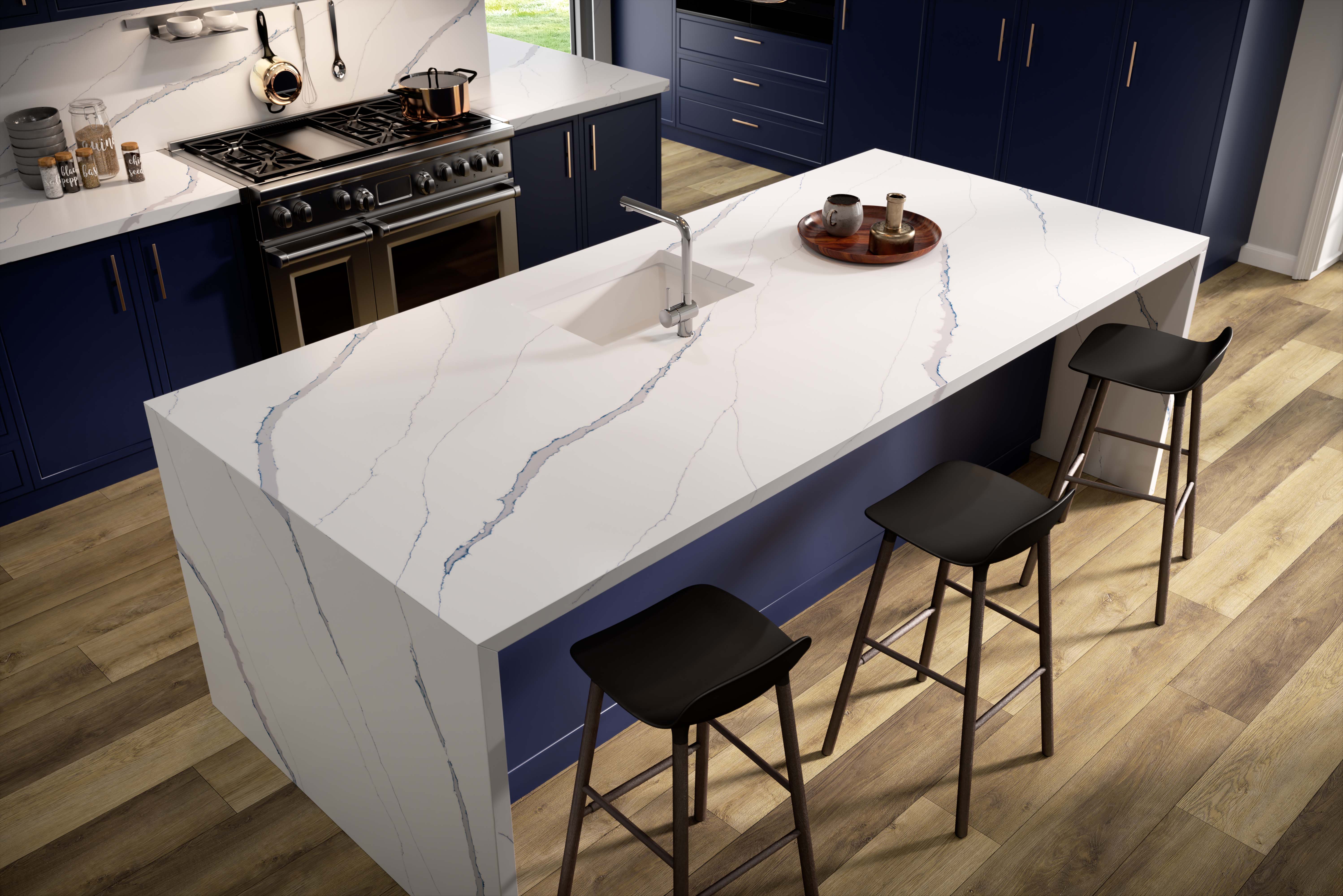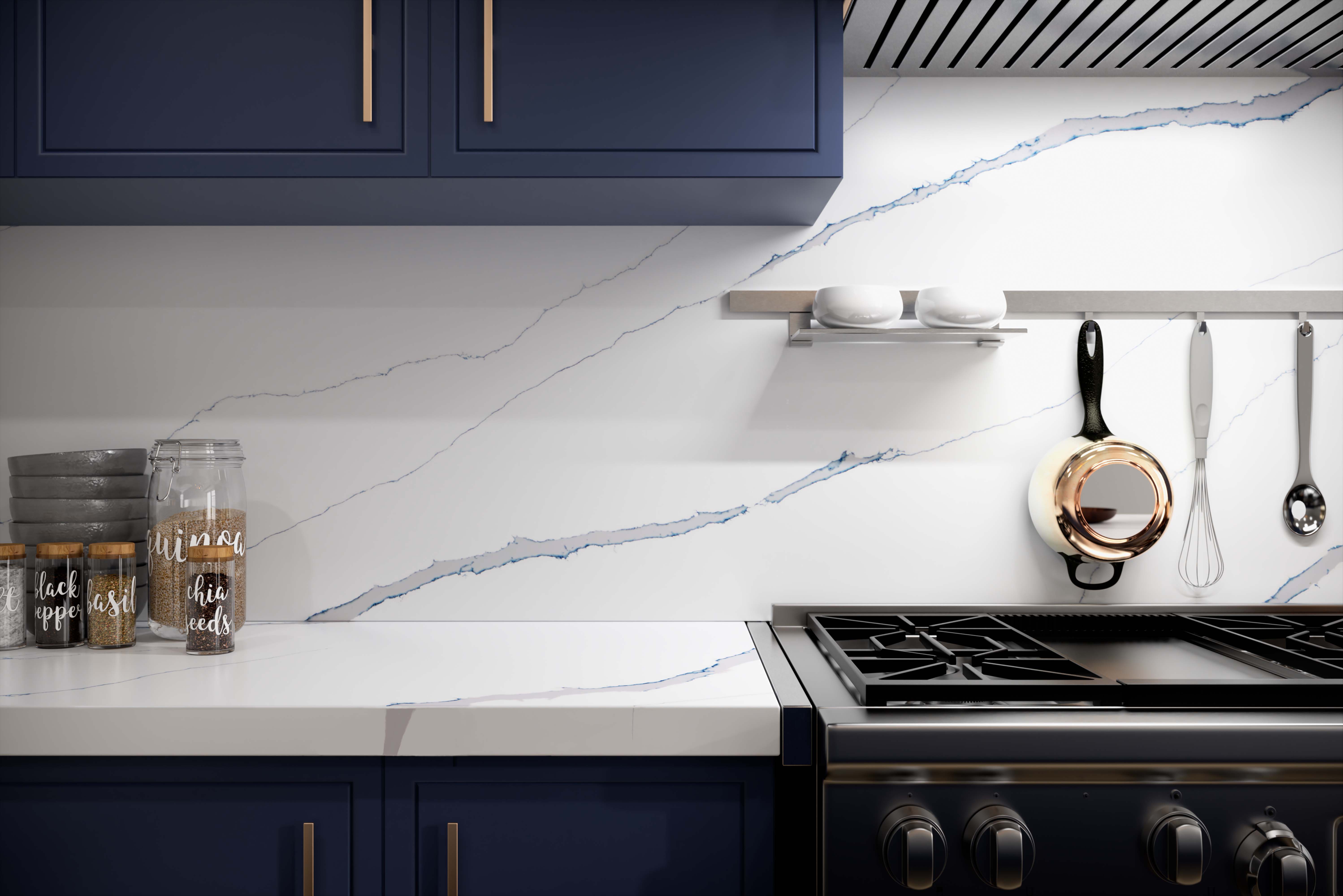 Calacatta Marina draws inspiration from the ocean’s vitality, where waves of blues rise, crest and fall with organic beauty. Delicate curvy and jagged pencil veins in two different Navy tones gracefully ascend across a pristine white surface revealing a natural flowing look. Full-bodied wide veins evolve with unexpected fluidity, accentuating natural borderlines as subtle depth and refined pattern variations appear. Fresh and lively, Calacatta Marina brings a splash of daring sophistication to modern and contemporary residential and commercial interior spaces.