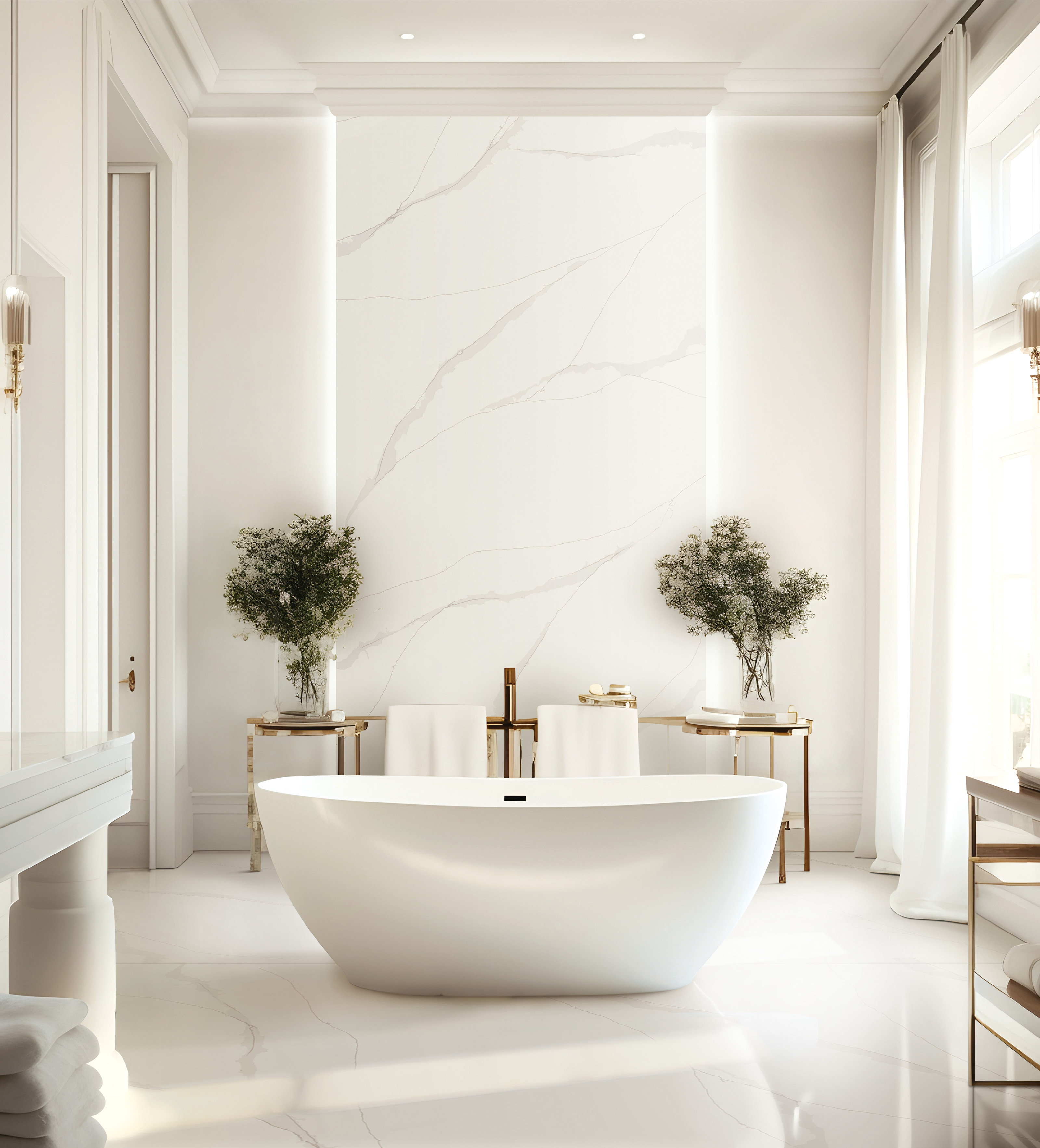 Calacatta Oro adds tranquil elegance to modern interiors with a muted off-white background and subtle vertical veins of varying thickness. Reminiscent of rare Calacatta marble, thick warm gray and thin gold-toned veins flow gracefully across the surface, adding a sense of aspirational movement. Calacatta Oro is perfect for cozy, serene, modern environments.
