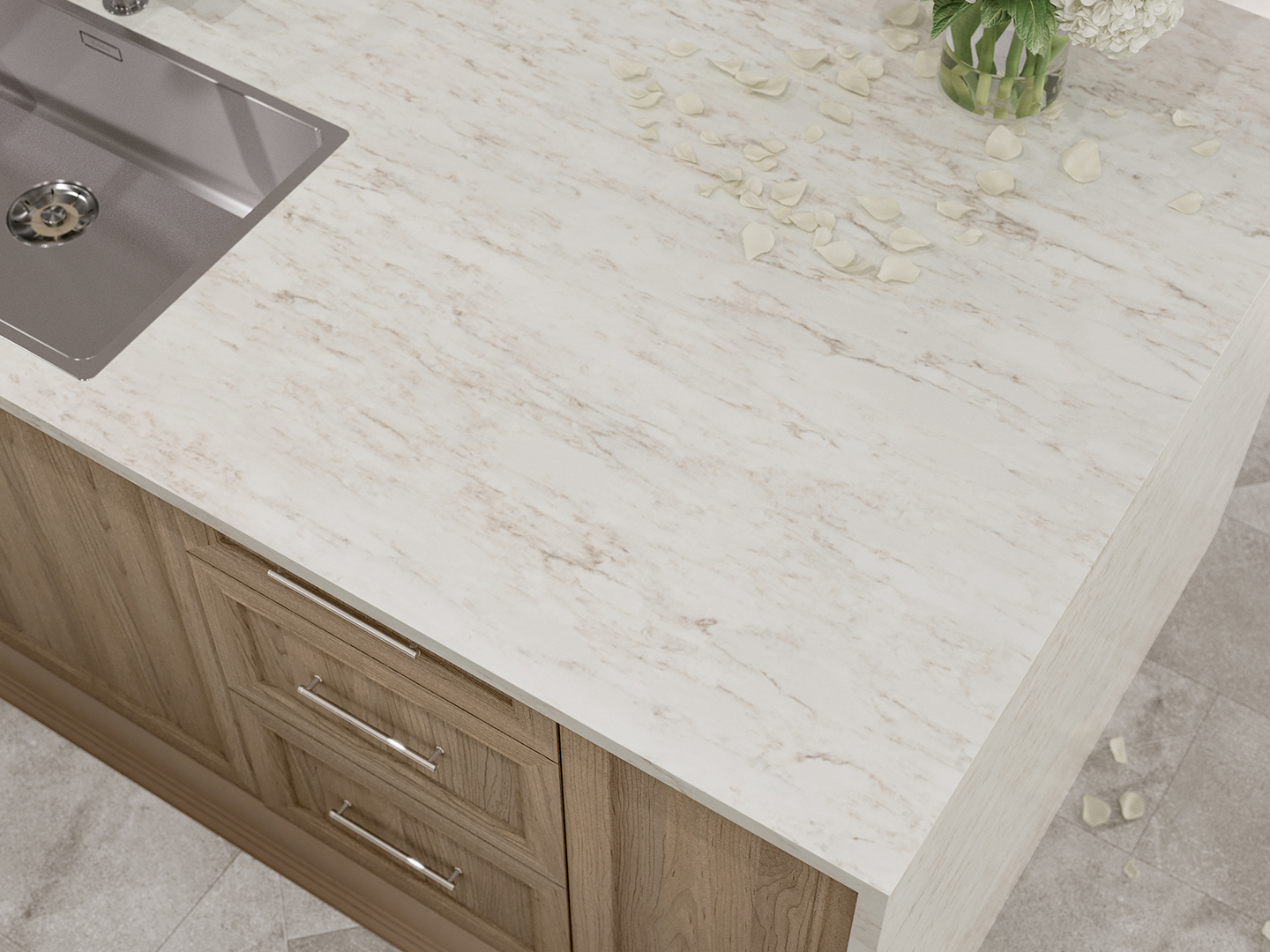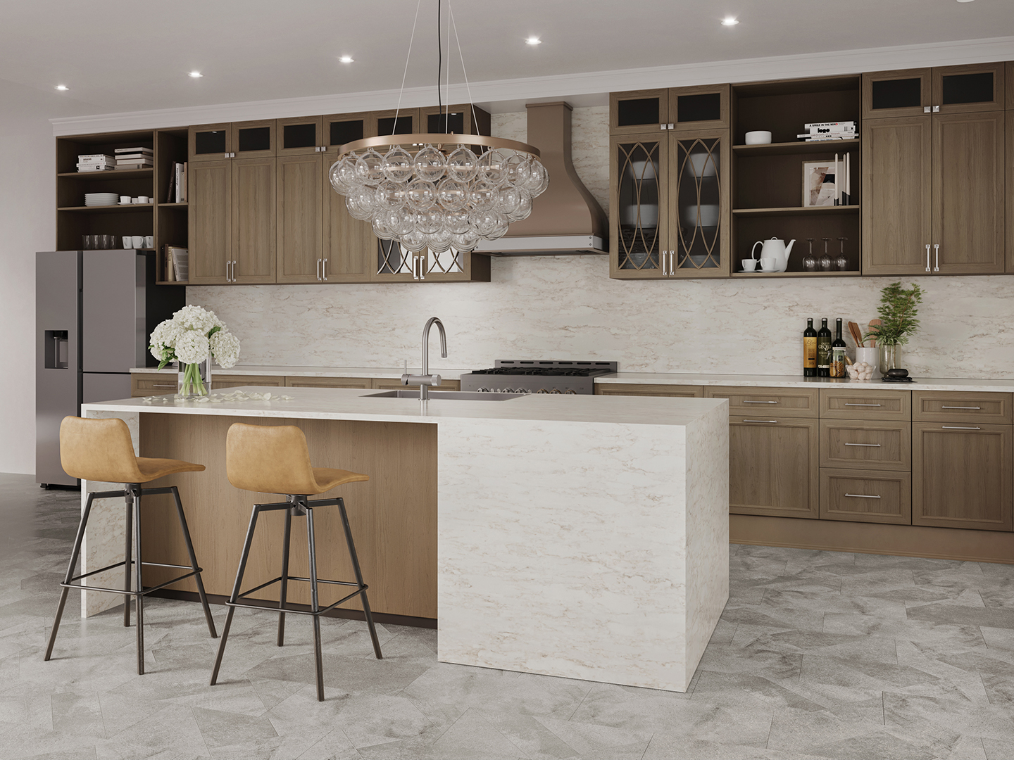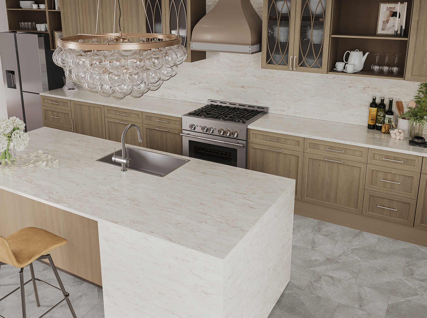 Natural elegance and majestic charm collide in the breathtaking design of Dolomites. Gold and gray veins naturally flow between the tone-on-tone white base, which gives a subtle sense of depth as if viewing Breccia marble. Expressing coolness and warmth at the same time, this inviting color creates an aesthetic resembling the natural and unique look of marble.