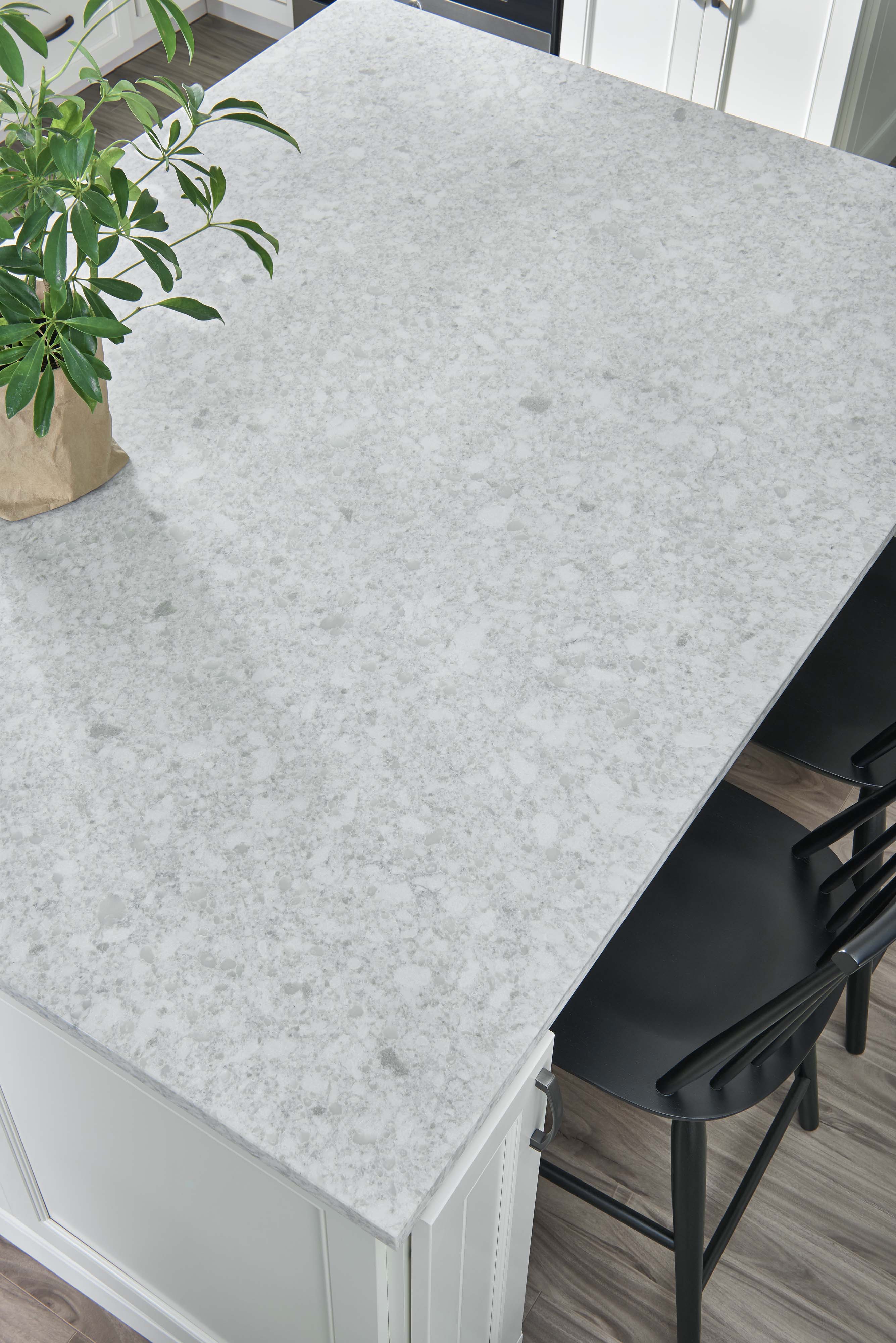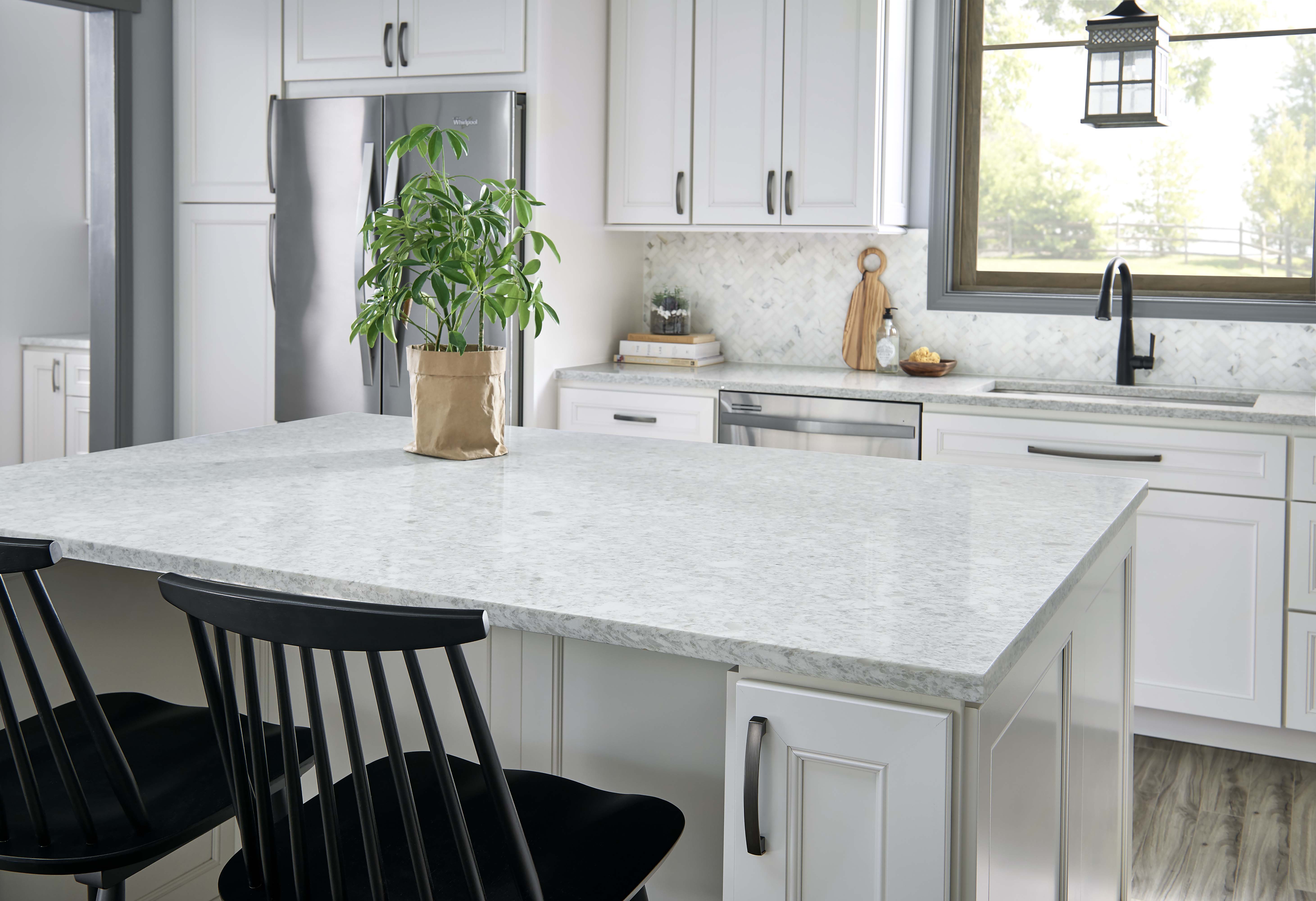 A mix of beige and gray whirled together in a marble pattern, White Pearl quartz surface that blends beautifully in an interior setting.